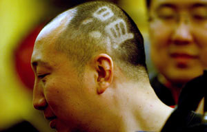 A reporter wears a hairstyle with the Chinese character of "Wen", the surname of Premier Wen Jiabao, to win the attention of the premier for a question during a news conference.