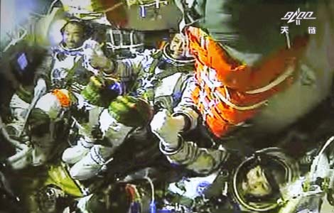 Three astronauts aboard the Shenzhou-10 spacecraft re-entered the orbiting Tiangong-1 space module after completing a manual docking procedure on Sunday.