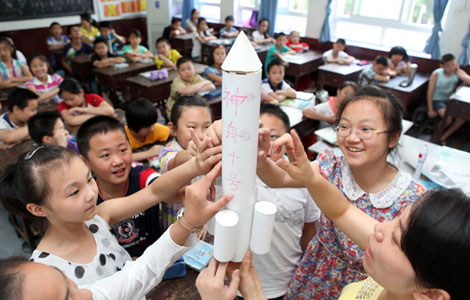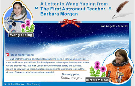 While China's first space teacher Wang Yaping is orbiting the earth, Barbara Morgan, the world's first astronaut who ever taught in space, was signing her name on a letter to greet the Chinese newcomer.