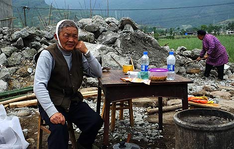 A family has dinner beside their ruined home in Wuxing village of Lushan county in Southwest China's Sichuan province, April 22, 2013.