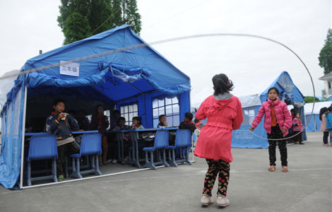 Daping Central Primary School students are back in class in a makeshift classroom in quake-hit Tianquan county, Southwest China's Sichuan province, April 25, 2013.