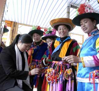 A tourist admires the embroidery on clothes of Tu minority girls on Friday in the Huzhu Tu Autonomous County in Northwest China's Qinghai Province. The girls organized a folk culture show to attract tourists during the National Day Holiday, and help them learn about some of the special features of Tu ethnic culture. [newsphoto.com.cn]