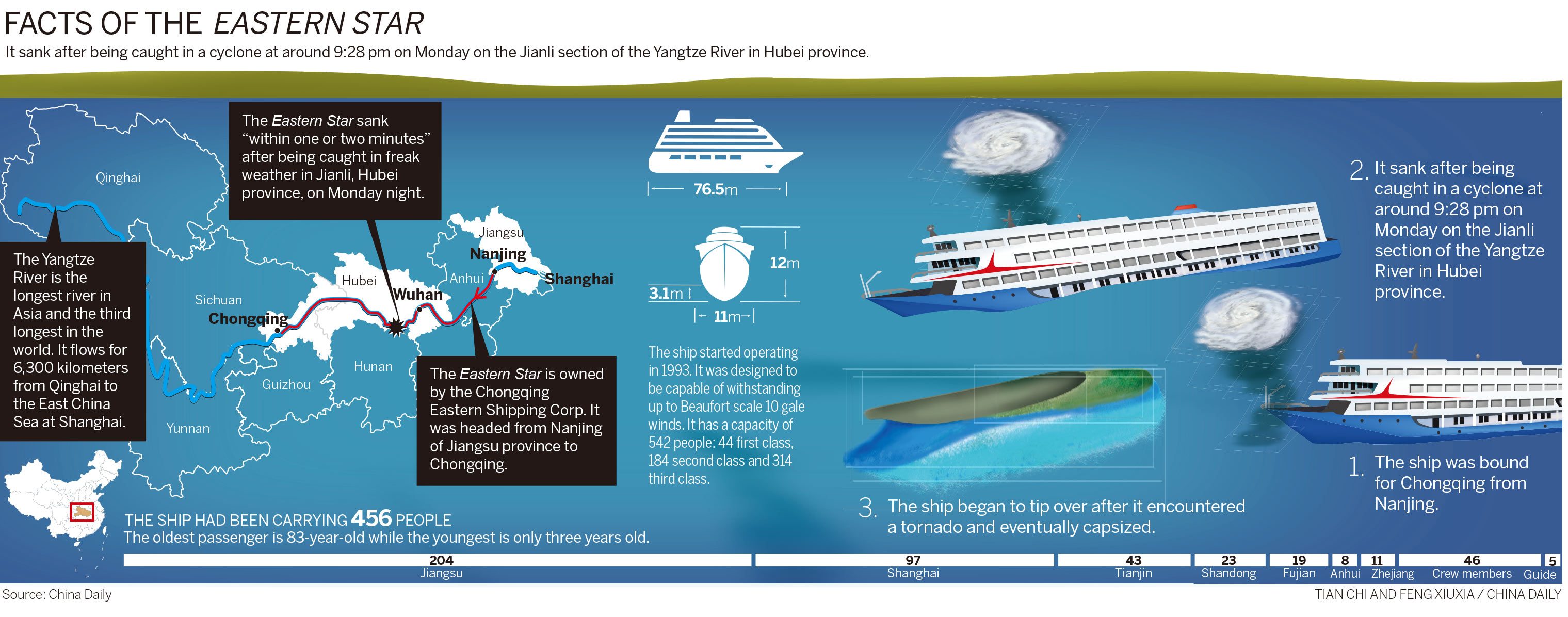 1. By 9:30 am Wednesday, 14 are confirmed dead, 14 have been found alive and 428 passengers remain missing after the worst recorded ship disaster on the Yangtze River.
