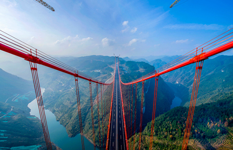 Qingshuihe Bridge in Southwest China's Guizhou province. "This is the second highest bridge in the world, with a depth of 406 meters and a length of 2,171 meters," said Zhang Mingshan, chief engineer of the Qingshuihe Bridge in Southwest China's Guizhou province. [Photo/IC]