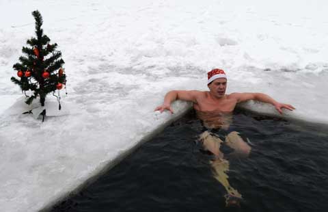 A woman swims in a partially frozen lake at a park in Shenyang, Liaoning province, China, November 30, 2015. [Photo/CFP]