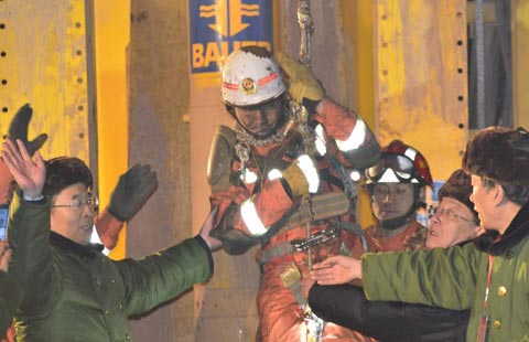One of the four surviving miners is lifted out after being trapped in a collapsed mine 36 days in Pingyi, East China's Shandong province, on Jan 29, 2016.