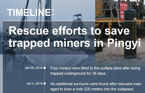 Four miners were lifted to the surface alive after being trapped underground for 36 days in Pingyi, East China's Shandong province, on Friday. Thirteen others still missing after the gypsum mine collapsed on December 25.