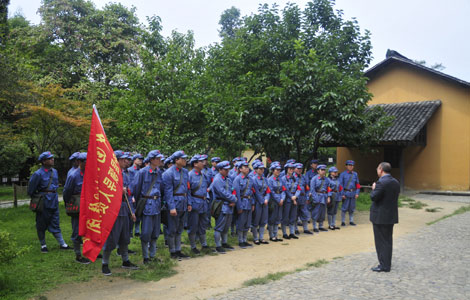 Staff members in Red Army uniforms visit Jinggang Mountain in East China's Jiangxi province on Sept 20, 2012.