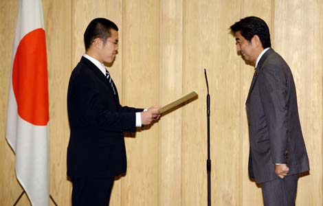 Shanghai-born Yan Jun (L), 26, receives a certificate of appreciation from Japan's Prime Minister Shinzo Abe for his rescue work in saving a nine-year-old boy from a typhoon-swollen river in Osaka on September 16, 2013, at Abe's official residence in Tokyo November 13, 2013.