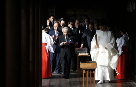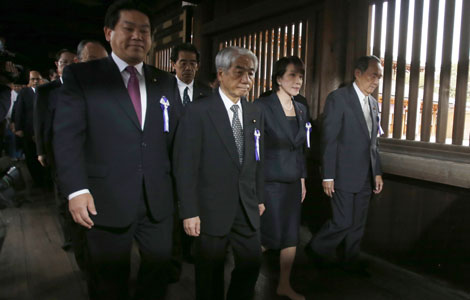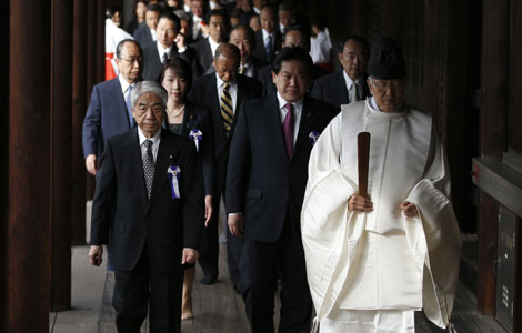 Japanese Internal Affairs and Communications Minister Yoshitaka Shindo and about 120 Japanese lawmakers on Friday worshipped the war-linked Yasukuni Shrine during its annual autumn festival.