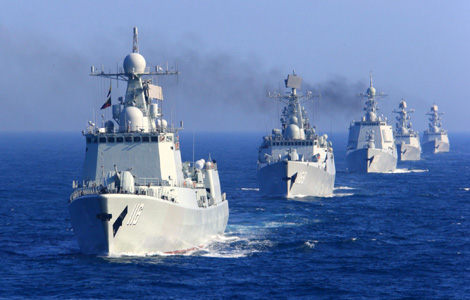 Chinese naval vessels, set to take part in Sino-Russian joint naval drills scheduled for July 5 to 12, conduct formation exercises, July 3, 2013.