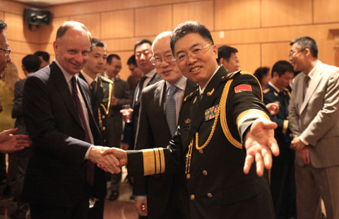 Zhou Ming (right), head of the military staff committee of the Permanent Mission of the People's Republic of China to the United Nations, and Liu Jieyi (center), China's permanent representative to the UN, greet General Adrian Foster, UN Deputy Military Advisor, at a reception to mark the 88th anniversary of the founding of the People's Liberation Army, on Thursday in New York.