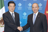 Chinese President Hu Jintao exchanged views with his Mexican counterpart Felipe Calderon in Los Cabos Sunday on bilateral relations.