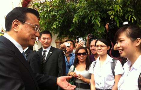 Chinese Premier Li Keqiang visited a bilingual school in the northern Thai city on Sunday, urging students to carry on the traditional friendship between the two nations.