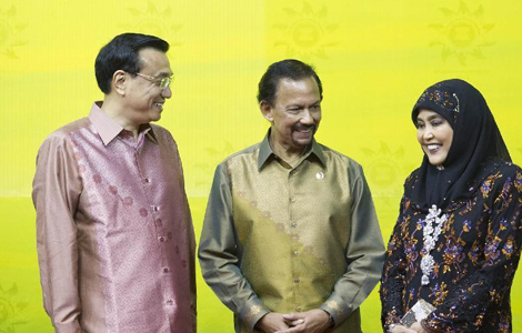 Chinese Premier Li Keqiang talks with Brunei's Sultan Hassanal Bolkiah and Brunei's Queen Hajah Saleha at a gala dinner Hassanal held for leaders attending the 23rd ASEAN summit and related summits, in Bandar Seri Begawan, Brunei.