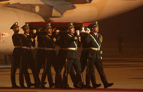 Astronaut candidates for the Shenzhou IX manned spacecraft attend a flag-raising ceremony at the Jiuquan Satellite Launch Center in Northwest China on June 10, 2012. Three of the six candidates will be selected to board the spacecraft, which will be launched in mid-June to perform the first manned space docking mission with the orbiting Tiangong-1 space lab module. [Photo/nfdaily.cn]