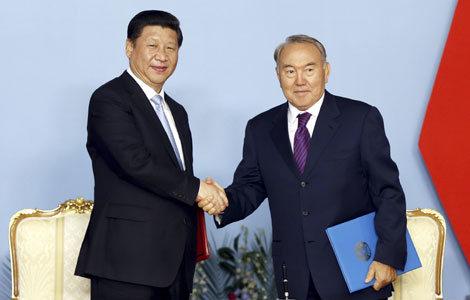 Visiting President Xi Jinping and his Kazakh counterpart Nursultan Nazarbayev agreed at a meeting on Saturday to strengthen bilateral ties.