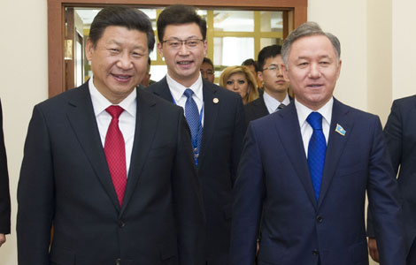 Visiting President Xi Jinping discussed bilateral ties with the speaker of Kazakh Parliament's Lower House Nurlan Nigmatulin on Saturday.
