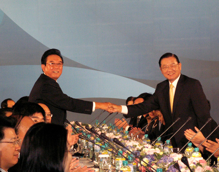 Chen Yunlin, president of the mainland's Association for Relations Across the Taiwan Straits (ARATS), shakes hands with Taiwan leader Ma Ying-jeou (R) during a meeting at the Taipei Guest House in Taipei November 6, 2008.