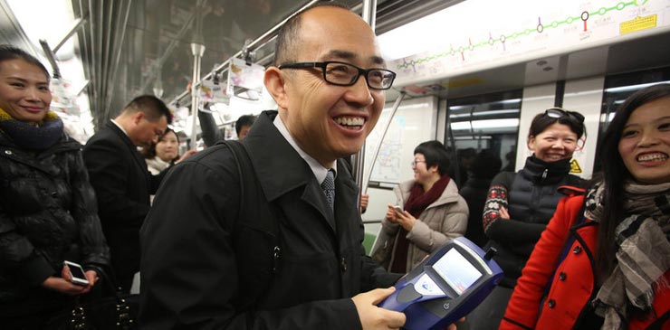 Pan Shiyi, chairman of Soho China, uses a PM2.5 density monitor a Shanghai subway on Jan 9, 2014. Pan arrived in Shanghai on Thursday, and took a 15-minute ride on Subway Line 2 from Hongqiao Airport to Jing'ansi station.