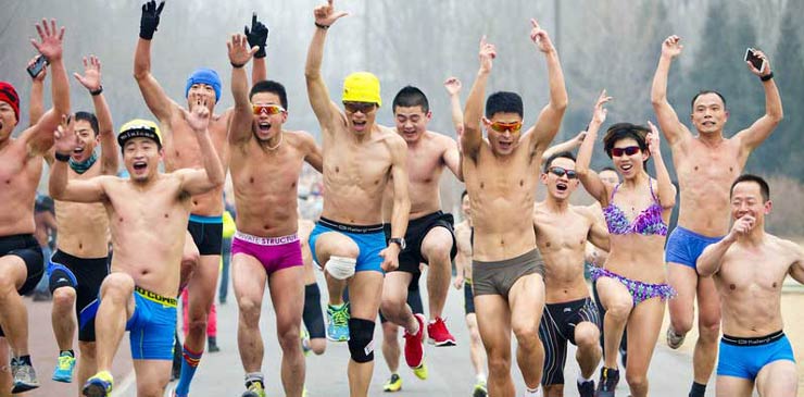 Contestants take part in an Undie Run at Beijing’s Olympic Forest Park, Feb 23, 2014. Thick smog has shrouded the capital for days and the city raised its four-tier alert system to "orange".