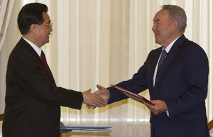 Visiting Chinese President Hu Jintao met with his Kazakh counterpart, Nursultan Nazarbayev, Monday to discuss ways to elevate China-Kazakhstan strategic partnership to a higher level.