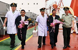 Two crew members, who were rescued by the NATO naval force in early May from a fishing ship hijacked by Somali pirates on April 1, are escorted by border defense officers in Huangdao Port in Shandong province, on Friday.