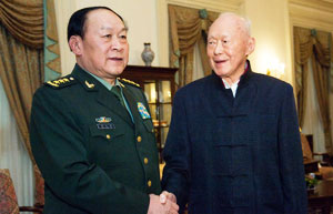 Singapore's Minister Mentor Lee Kuan Yew met with visiting Chinese State Councilor and Defense Minister Liang Guanglie here on Monday.