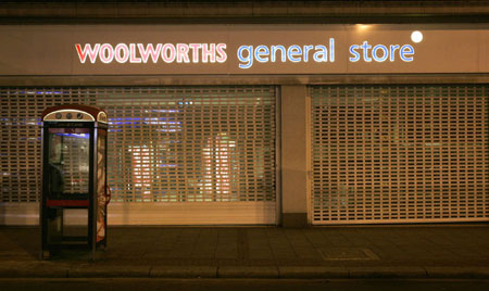 The shutters are down after the last day of opening of a Woolworths store in Streatham in south London December 27, 2008. Administrators began closing the stores of Woolworths, one of Britain's best known retailers, on Saturday. The household name, which sold everything from chocolate bars to toasters and televisions, is the highest profile retail casualty of the global financial crisis and Britain's economic downturn. Woolworths collapsed into administration in November and its administrators said earlier this month all its stores would close by Jan. 5, with the loss of 27,000 jobs, unless a last-minute buyer could be found. [Agencies]