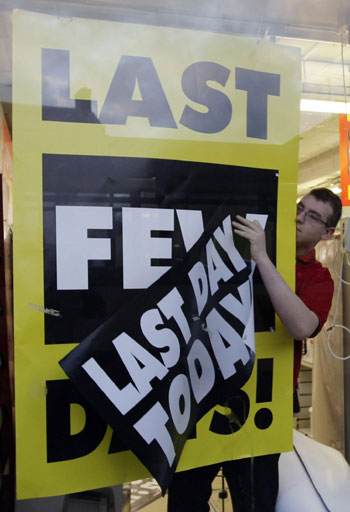 A worker changes a sign in the window of the Woolworths store in Ashby de la Zouch, central England December 27, 2008. Administrators began closing the stores of Woolworths, one of Britain's best known retailers, on Saturday. The household name, which sold everything from chocolate bars to toasters and televisions, is the highest profile retail casualty of the global financial crisis and Britain's economic downturn. Woolworths collapsed into administration in November and its administrators said earlier this month all its stores would close by Jan. 5, with the loss of 27,000 jobs, unless a last-minute buyer could be found. [Agencies]