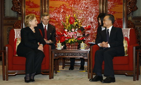 ![]() Chinese Premier Wen Jiabao talks to US Secretary of State Hillary Clinton during a meeting in Beijing February 21, 2009. Clinton said on Saturday the United States and China can pull the world out of economic crisis by working together. [Agencies]