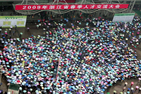 Job seekers holding umbrellas flock to a job fair at Hangzhou Peace International Convention & Exhibition Center, Hangzhou, East China's Zhejiang province, February 28, 2009. About 1,300 employers have set up booths at the job fair that offers 26,000 jobs. [Xinhua]