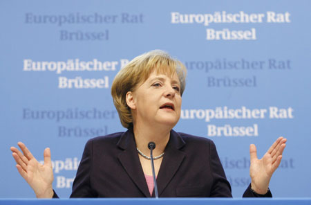 Germany's Chancellor Angela Merkel gestures during a news conference after an emergency European Union leaders summit in Brussels March 1, 2009.[Agencies]
