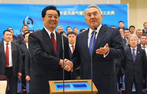 Chinese President Hu Jintao and Kazakh President Nursultan Nazarbayev on Saturday pledged to advance their countries' strategic partnership.