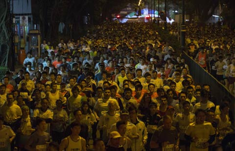 Participants run at Tsim Sha Tsui as they compete in the Hong Kong Marathon Feb 16, 2014. More than 75,000 people took part in the 10-km, half-marathon and marathon races in the territory on Sunday, organizers said.