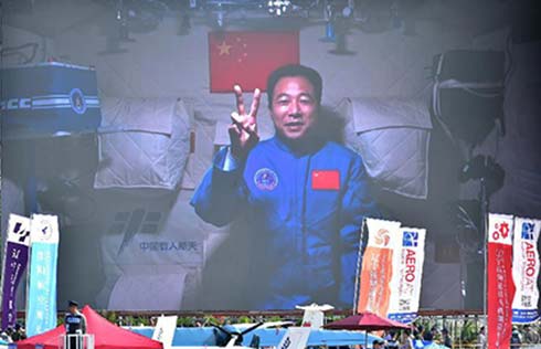 Photo taken on Nov 1, 2016 shows a screen broadcasting Chinese astronaut Chen Dong sends his best wishes from the space lab Tiangong-2 to the on-going 11th China International Aviation and Aerospace Exhibition in Zhuhai, South China's Guangdong province.