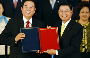 Chen Yunlin (R), president of the mainland's Association for Relations Across the Taiwan Straits, shakes hands with Chiang Pin-kung, chairman of the Taiwan's Straits Exchange Foundation, during a welcome ceremony before cross-Strait meetings in Taipei on Dec 20, 2010.