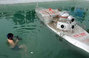 A laid-off worker in Wuhan successfully tested his homemade submarine on Tuesday, hoping it could attract attention from the local aquatic product breeding industry.