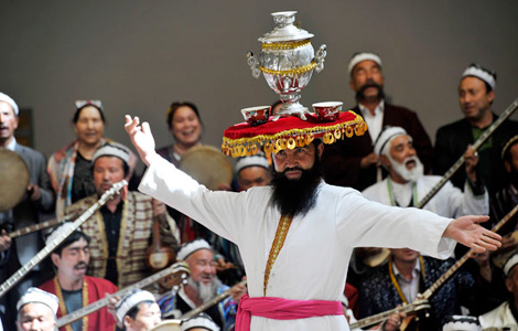 Artists perform Muqam, a traditional Uygur song and dance cycle, in Shche county, Northwest China's Xinjiang Uygur autonomous region, April 16, 2013.