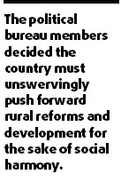 The political bureau members decided the country must unswervingly push forward rural reforms and development for the sake of social harmony. In this process, efforts must be made to consolidate and strengthen agriculture as the foundation of the economy and food security must be made the top priority.