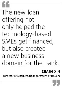 "The new loan offering not only helped the technology-based SMEs get financed, but also created a new business domain for the bank," Zhang Xin, director of retail credit department of BoCom said at the 10th China Hi-Tech Fair held in Shenzhen in October.