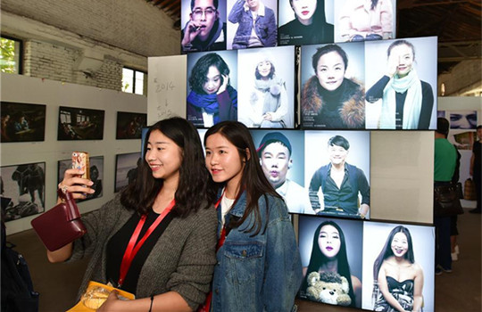 Des visiteurs observent des oeuvres lors du Festival international de la photographie de Pingyao, à Pingyao, dans la province chinoise du Shanxi (centre), le 19 septembre 2016.