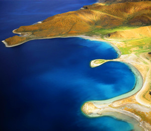 Vue aérienne du lac Yamzho Yumco au Tibet