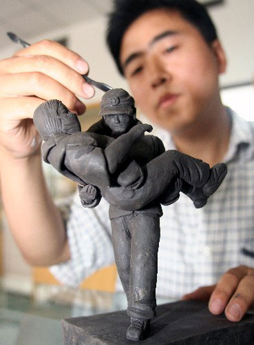 A craftsman polishes clay figures at the Huishan Clay Figure Factory in Wuxi, east China's Jiangsu Provinc, on June 12. The clay figures depict the rescue and relief efforts after the May 12 earthquake. Huishan clay figures are a time-honored Chinese folk art admired for their succinct designs, bright colors and vivid images. [Photo: Xinhua]