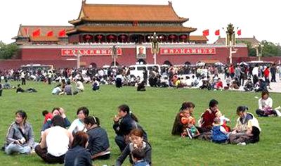 Visitors have a picnic on the lawn even though there is a sign that says "Please Keep off the Grass"