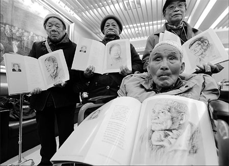 Chen Zhongyuan (front right) and other survivors of the Nanjing Massacre show their portraits in the book Living History: Poetry and Portraits of Nanjing Massacre Survivors, in Nanjing, Jiangsu province, on Monday. Han Yuqing / Xinhua |