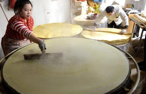 Folk artist Dai Wanzhi shows his 21-meter-long painting which keeps a record of Shehuo performance in Daijia village of Xi'an, capital of Northwest China's Shaanxi province in the 1950s. Most Shehuo performances take place around traditional Chinese festivals, especially at temple fairs during Spring Festival and the Lantern Festival. The performance of Shehuo can be traced back to ancient rituals held by the ancestors of the Chinese people to worship the earth, which they believe would bring good harvests and fortune.