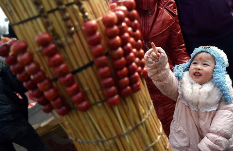 A vendor sells gourd craftworks at a market in Shenyang, capital of Northeast China's Liaoning province, Feb. 15, 2015. Local residents are busy with purchasing "nianhuo", or basic goods and necessities for the coming Spring Festival, which falls on Feb. 19 this year. [Photo/Xinhua]