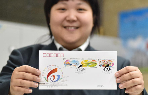 A commemorative stamp marking the 60th anniversary of the founding of Xinjiang Uygur autonomous region is seen in Beijing, capital of China. China Post issued a special stamp set for the 60th anniversary of the founding of Xinjiang Uygur autonomous region on Thursday. The set contains three commemorative stamps with respective themes.[Photo/Xinhua] |