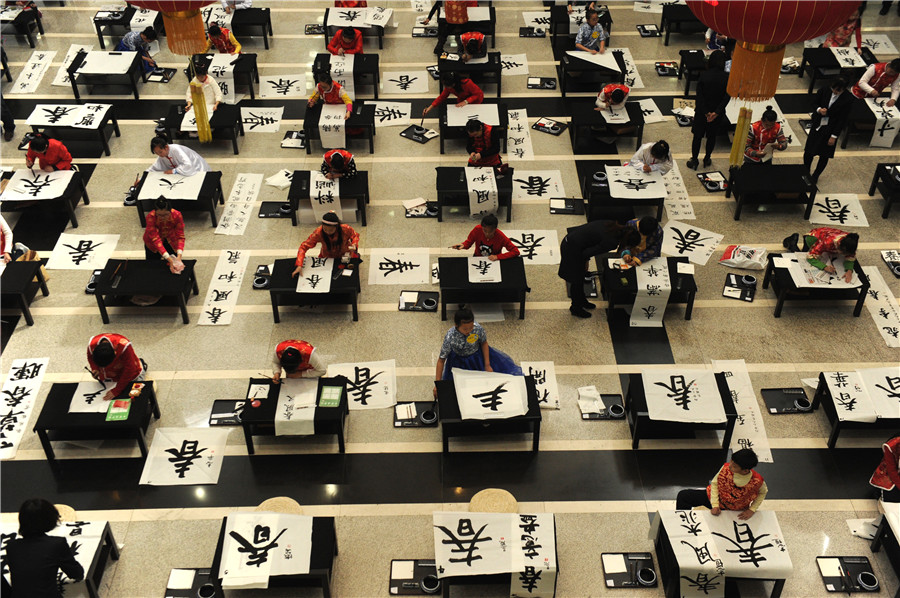 A group of youngsters participate in a "spring" themed calligraphy competition in Dalian, Liaoning province on Feb 20, 2016. The competitors are required to choose one of four different styles of calligraphy, including regular script, clerical script, seal script or running script. Then, they are tasked with printing the Chinese character for "spring" or verses with a theme that is appropriate for the season. [Photo/CFP]